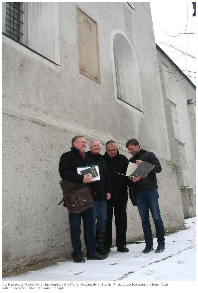 Am 5. Februar erinnerte Uwe Koch in einem Vortrag im Museum Bautzen an die mit der sächsischen Geschichte eng verwobene Familiengeschichte der Bautzener Familie Behrnauer. Mit der Übergabe des nunmehr von der Bautzener Firma agora restaurierten Epitaphs Jacob Behrnauers an der Bautzener Liebfrauenkirche wurde überdies ein geschichtlich bedeutsames Erinnerungsmal an die Beteiligung Oberlausitzer an den Kämpfen zur Abwehr der Streitmacht Sultan Süleimans des Prächtigen 1529 in Wien bewahrt. Die Behrnauers zählten vom 16. bis zum Ende des 19. Jahrhunderts zur bürgerlichen Oberschicht Bautzens und der Oberlausitz. Jacob Behrnauer d.Ä. war 1553 in Bautzen verstorben, sein Neffe, der mit einer Enkelin Caspar Peucers verheiratete Arzt Jacob Behrnauer d. J. setzte ihm 1631 dieses Denkmal. Über drei Jahrhunderte stellten die Behrnauers Bürgermeister, Ärzte, Pädagogen, Pastoren, hohe Verwaltungsbeamte und Intellektuelle. Karl Gottlieb Behrnauer (1765-1831)wechselte 1815 nach dem Wiener Kongress aus sächsischen Diensten in höchste Ämter Preußens. Im 18. Jahrhundert zählten der Bürgermeister Jeremias Behrnauer und sein Cousin der Rektor Georg Ehrenfried Behrnauer zu den für die Entwicklung der Mättigschen Stiftung prägenden Persönlichkeiten.